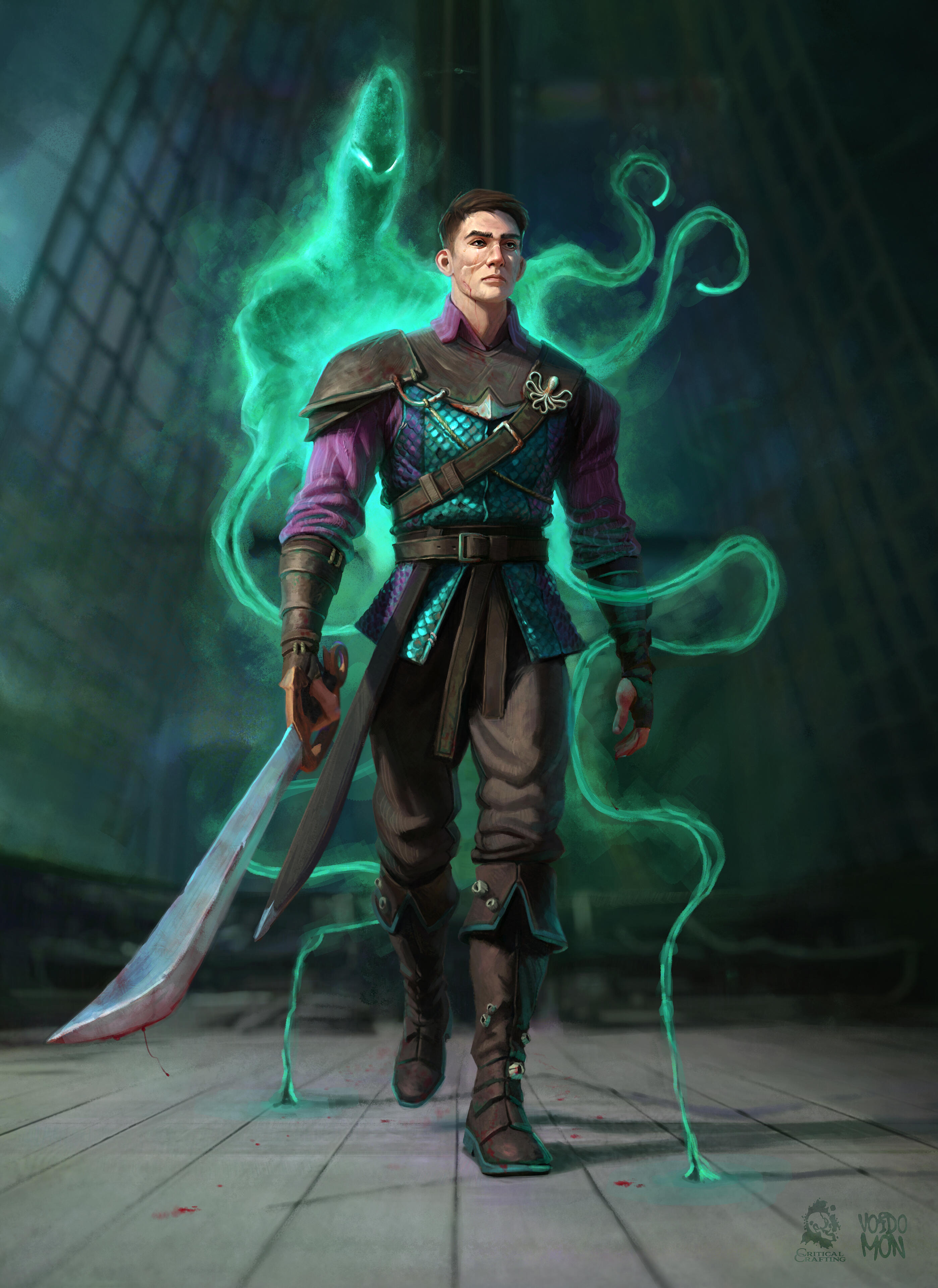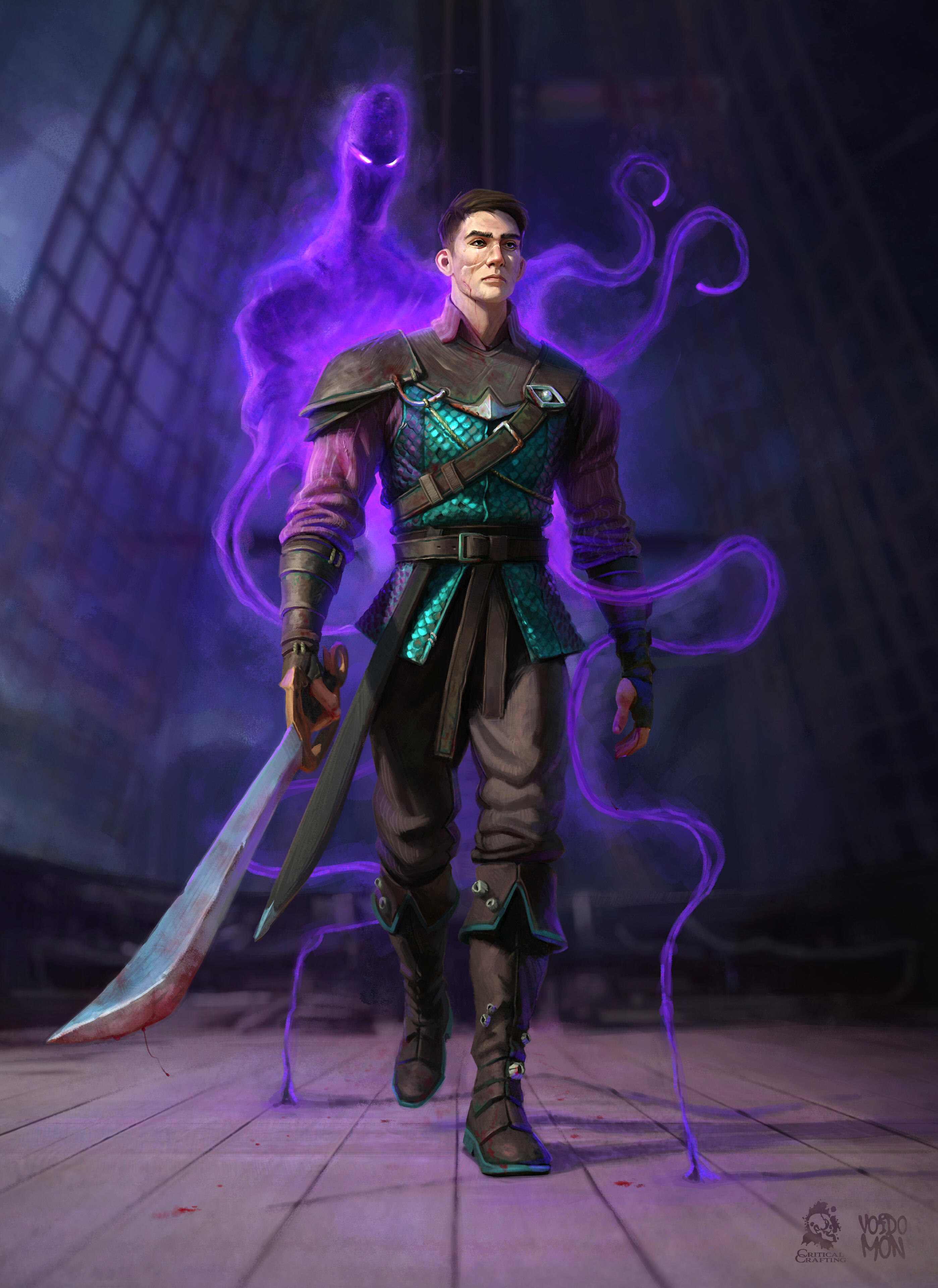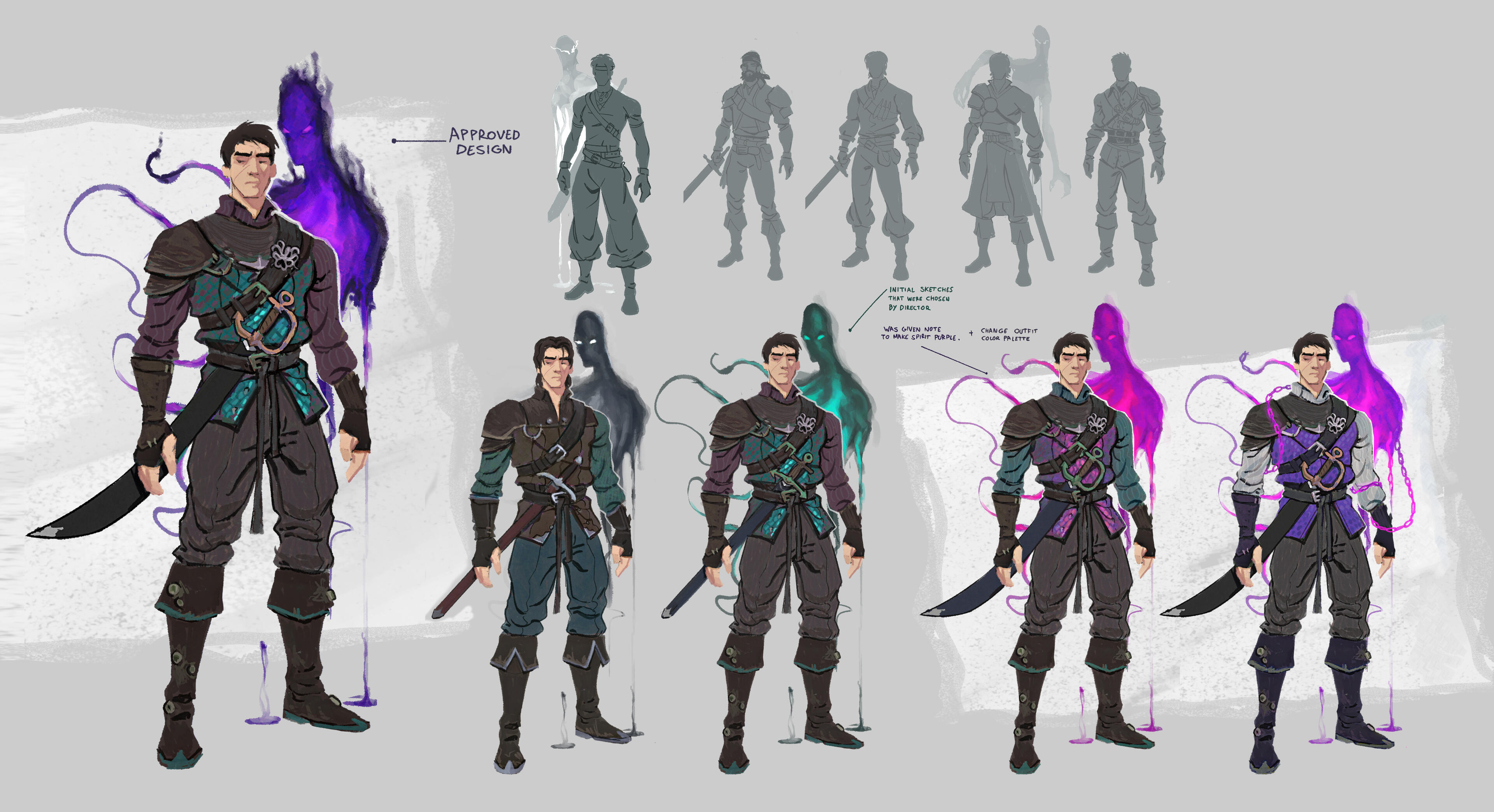 I was tasked with bringing to life a "bladesman" (Tether) with a "kind of swashbuckler look", that is followed over the shoulder by a sort of incorporeal spirit (Ardent).